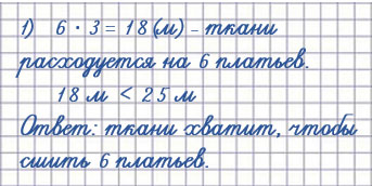 3. В куске 25 м ткани. Хватит ли этой ткани, чтобы сшить 6 платьев, расходуя на каждое по 3 м ткани? Сколько метров ткани останется, если расходовать на каждое по 4 м?