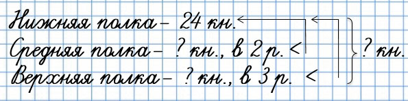 На нижней полке 24 книги, а на верхней - в 3 раза меньше. Вычислим, сколько книг на верхней полке: