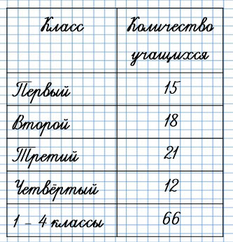 Мы знаем, что в 1 классе 15 человек, во 2 классе - 18 человек, в 3 классе - 21 человек, в 4 классе - 12 человек. Узнаем, сколько человек в четырёх классах вместе: