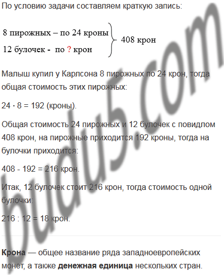 Малыш купил у Карлсона 8 пирожных и 12 булочек с повидлом, заплатив за всю покупку 408 крон. Одно пирожное стоит 24 кроны. Какова цена одной булочки?