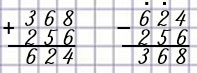 Пишу (единицы под единицами, десятки под десятками, сотни под сотнями): 368 + 256.