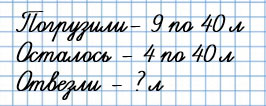 6. В машину погрузили 9 бидонов с молоком, по 40 л в каждом. Когда часть молока отвезли в детскую больницу, в машине осталось 4 бидона. Сколько литров молока отвезли в больницу?