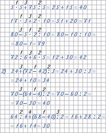 | 84 : 4 • 3 + 2 = 65 1) 84 : 4 = 21 2) 21 • 3 = 63 3) 63 + 2 = 65 | 5 • 5 + 75 : 5 = 40 1) 5 • 5 = 25 2) 75 : 5 = 15 3) 25 + 15 = 40 |