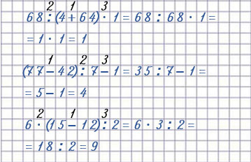 | 90 - 36 : 3 • 2 = 66 1) 36 : 3 = 12 2) 12 • 2 = 24 3) 90 - 24 = 66 | 17 + 16 • 3 • 0 = 17 1) 16 • 3 = 48 2) 48 • 0 = 0 3) 17 + 0 = 17 |