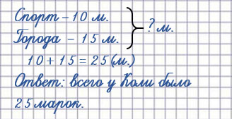 1) У Коли было 10 марок на тему "Спорт" и 15 марок на тему "Города". Сколько всего марок было у Коли?