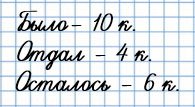 У Димы было 10 конфет, 4 конфеты от отдал сестре. Сколько конфет осталось у Димы?
