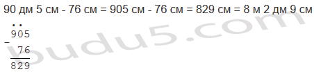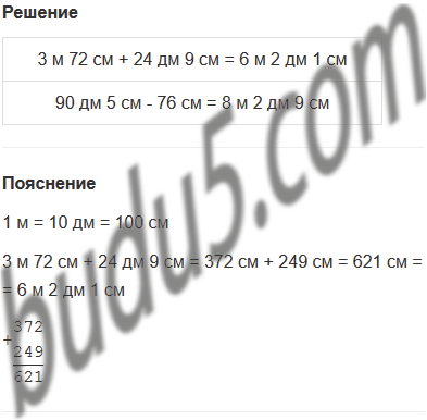 | а) 3 м 72 см + 24 дм 9 см; | б) 90 дм 5 см - 76 см. |