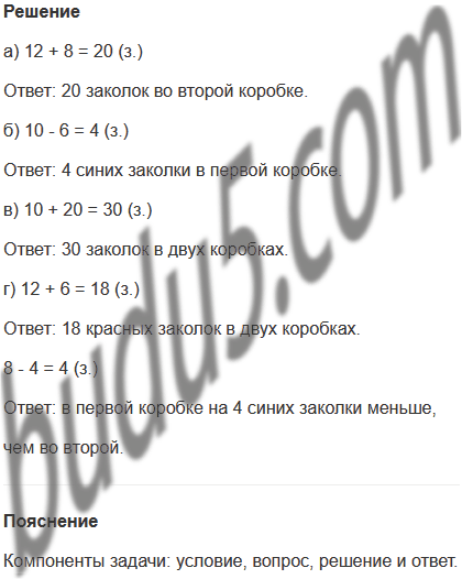 Задание № 10. В первой коробке 10 заколок. Среди них 6 красных, а остальные синие. Во второй коробке 12 красных и 8 синих заколок. Сколько: а) заколок во второй коробке? б) синих заколок в первой коробке? в) заколок в двух коробках? г) красных заколок в двух коробках? В какой коробке меньше синих заколок и на сколько?