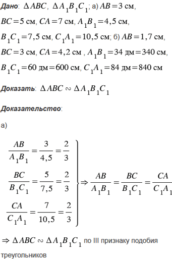 Подобны ли треугольники АВС и А1В1С1, если: а) АВ = 3 см, ВС = 5 см, СА = 7 см, А1В1 = 4,5 см, В1С1 = 7,5 см, С1А1 = 10,5 см; б) АВ = 1,7 см, ВС = 3 см, СА = 4,2 см , А1В1 = 34 дм, В1С1 = 60 дм, С1А1 = 84 дм?