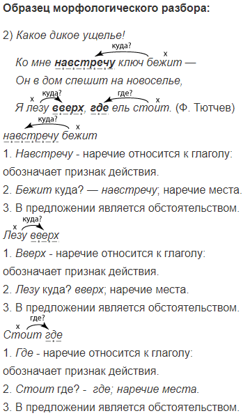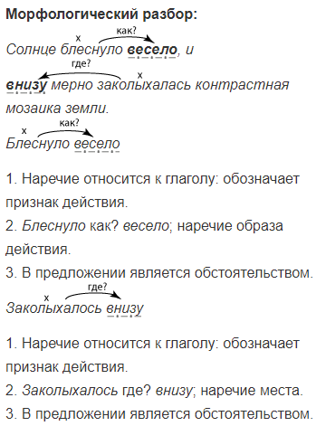 Познакомьтесь с планом (см. справочные материалы учебника) и образцами морфологического анализа наречий и слов категории состояния. Затем выполните разбор наречий из последнего предложения текста упр. 657