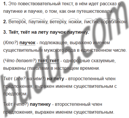 Ветерок дохнул, паутинку метнул и понёс паучка. Ткёт, ткёт на лету паучок паутинку. Паутинка длиннее, а ветерку веселее. Перенёс ветерок паучка далеко.