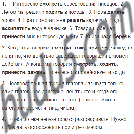 1. Интересно (смотрю) соревнования пловцов. 2. Летом мы решили (хожу) в походы. 3. Пора (делаю) уроки. 4. Брат помогал мне (решаю) задачу. 5. Надо (вскипячу) воду в чайнике. 6. Товарищ обещал (принесу) мне интересную книгу. 7. Книги надо (берегу).