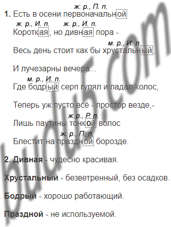 1. Прочитайте стихотворение Ф. Тютчева. Спишите. Определите род и падеж прилагательных, выделите окончания.