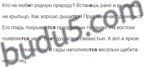 Кто не люб..т родную природу? Встан..шь рано и выход..шь на крыльцо. Как хорошо дышит..ся! Пруд начинает дымит..ся. Его гладь покрывает..ся прозрачным туманом. На востоке появляет..ся заря. Ве..т душистой свежестью. А вот и яркое солнце показалось, и сады наполняют..ся весёлым щебетанием птиц.