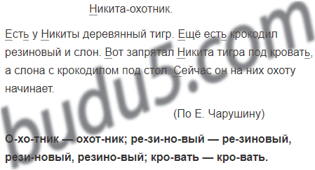 Раздели на слоги и для переноса слова: охотник, резиновый, кровать. Найди слова с ь. Подчеркни ь и большую букву в словах.