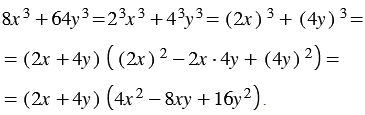 Используя свойства степени, представляем данный многочлен в виде суммы кубов двух выражений, получаем: